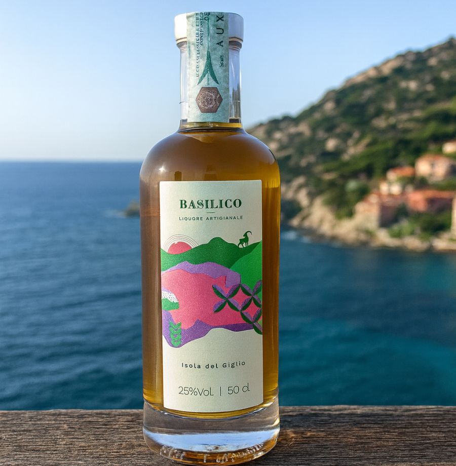 Liquore ottenuto dall'infusione di basilico dell'Isola del Giglio. Prodotto ed imbottigliato Az. Jacobelli Liquori Sas - Capalbio (GR)